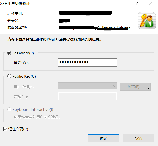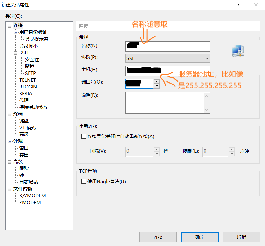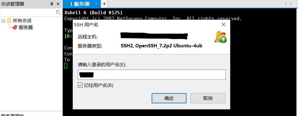 双击左侧会话管理器里刚建的服务器,在弹出的窗口里填入登录用的用户名,选上记住用户名。