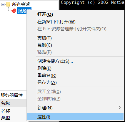 - 首先右击会话管理器里的服务器标签,在菜单点击属性。