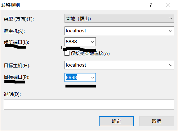 - 输入两个端口号,我这输入的是jupyter notebook默认的8888端口,然后点确定