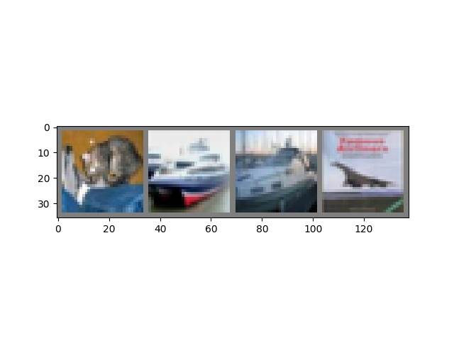 GroundTruth: cat ship ship planeok,现在让我们看看神经网络认为上面的例子是什么:
